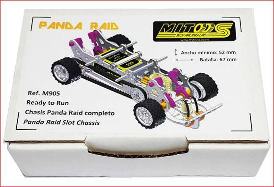 Xassís Panda Raid complet llest per rodar de batalla 67 mil·límetres, és el xassís més estret del mercat, ample total (rodes incloses) 52 mil·límetres, longitud del braç basculant 32 mm, pes total 78,1 grams, xassís per a carrosseria del Seat Panda d’Scalextric, guia basculant amb topall retorn regulable, tracció total 4×4 per corretges dentades, cobreix carter / defensa davantera d’acer plegat, suports per a carrosseria suspesa, politges d’alumini, set d’eines desmuntable i set de rodes per configuració ral·li inclosos.
