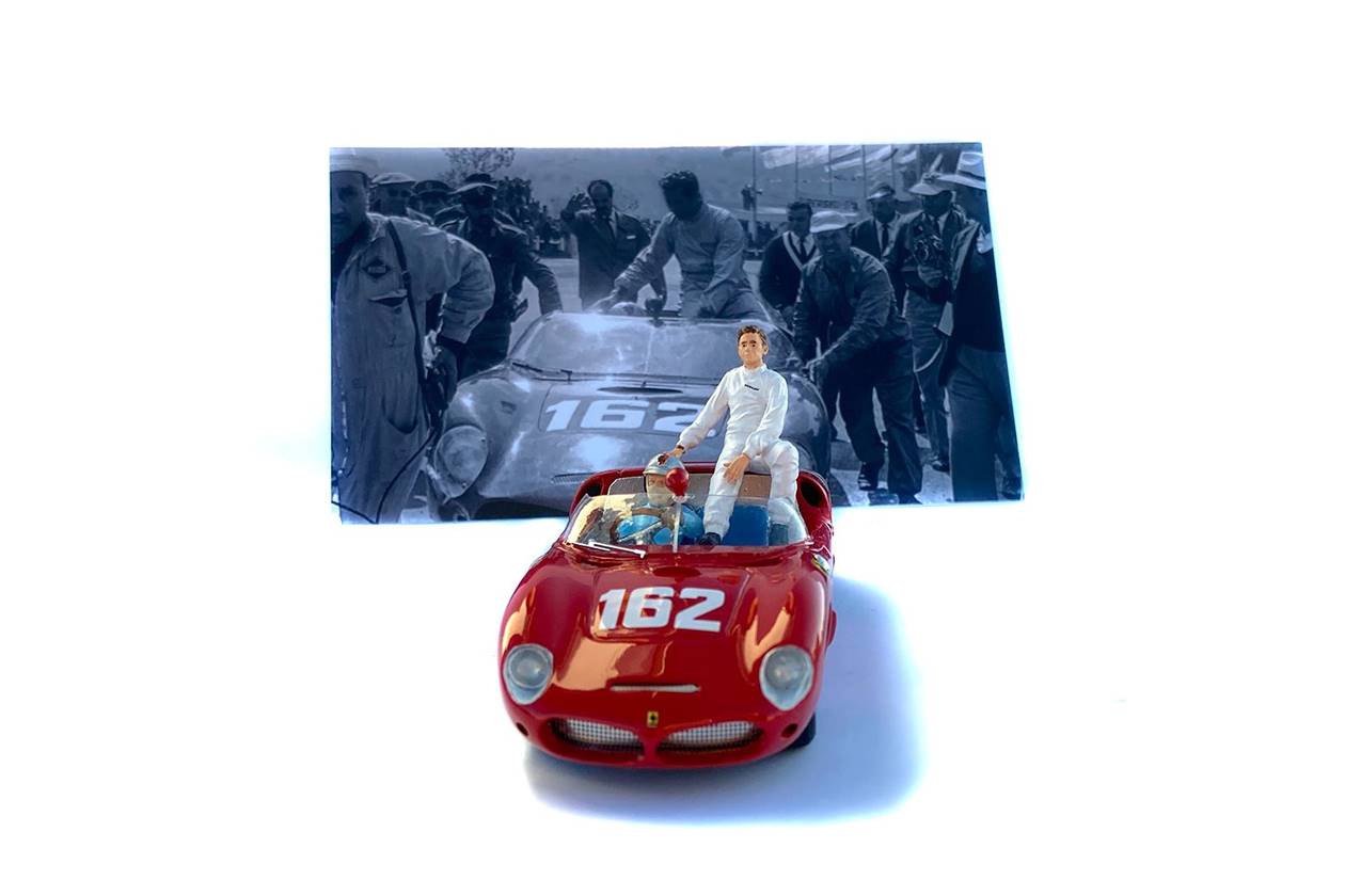 A parte de Von trips al volante, hemos querido reproducir la escena en la que tras ganar la carrera, Olivier Gendebien sube al 246 SP para dirigirse al podio. Para ello incluimos una detallada réplica del piloto belga, preparada para sentarse en el capó trasero tal y como lo hizo el 30 de Abril de 1961. (Cada unidad incluye una figura guardada debajo de la peana de exposición para un óptimo envío.)