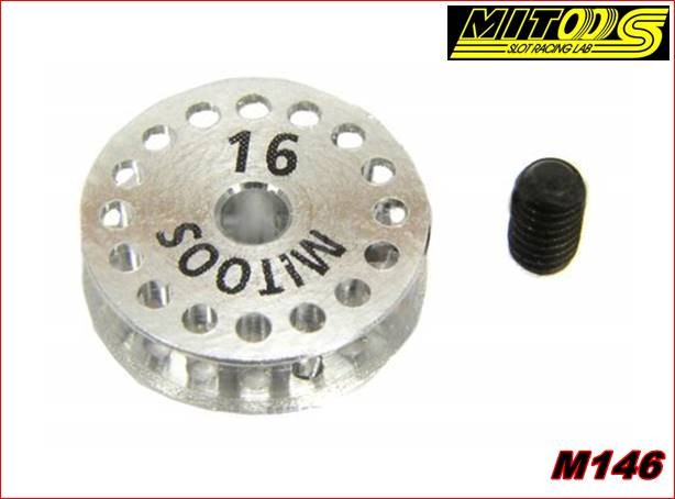 Polea dentada 16d. Diámetro 9,8 x 3,6mm. Fijación M2,5 x 3mm. Eje 3/32.